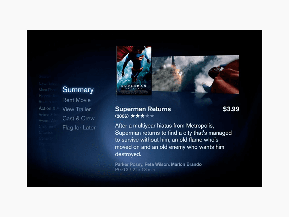 As lead designer, we were tasked with envisioning how people could explore, preview, and discover movies in a rich, interactive interface.